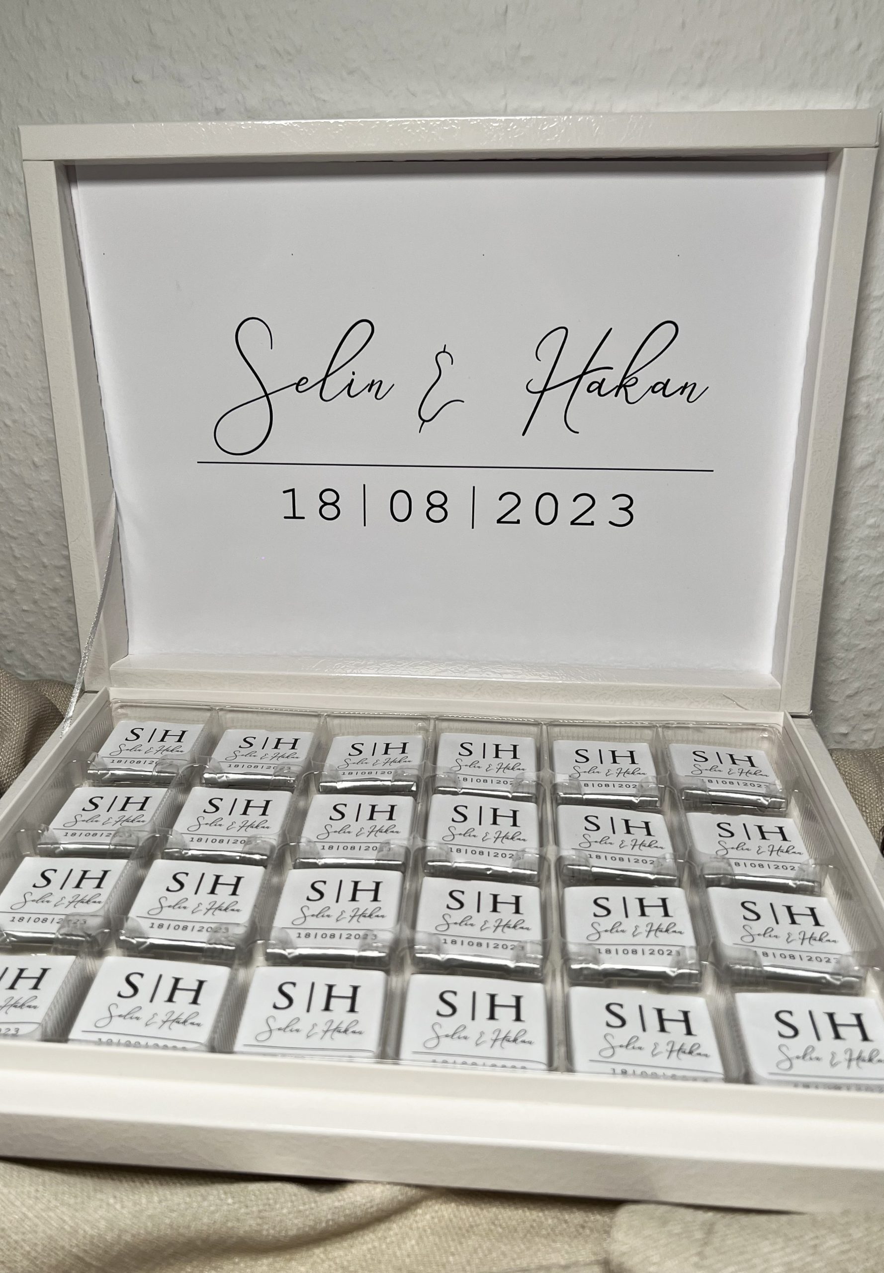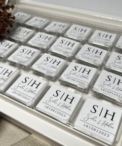 Diese handgefertigte Schokoladenbox besteht aus hochwertiger Vollmilchschokolade und ist in einer schlichten weißen Box verpackt. Der personalisierte Deckel mit Namen und Datum macht sie zu einem einzigartigen Andenken für Sie und Ihre Gäste.